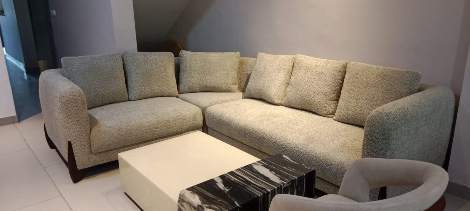 Boucle fabric sofa set with grey and black touch.